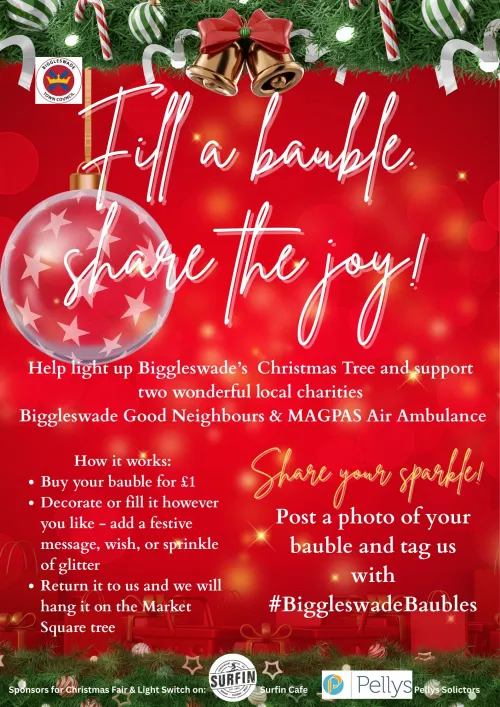 Every £1 raised goes to support the Mayor's chosen charities, Biggleswade Good Neighbours & MAGPAS Air Ambulance. Your bauble can make a difference!