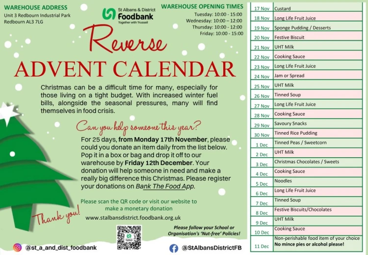 Countdown to Christmas by helping local families in need. St Albans District Foodbank have launched their reverse Advent Calendar for 2025 which runs from 17th November to 11th December.