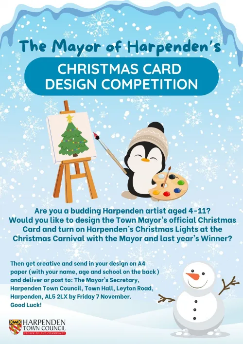Children aged 4-11 are invited to design a Christmas card for the Harpenden Town Mayor. The winner will have their design used for the Mayor's official Christmas Card and will be invited to turn on the Town Christmas lights at the Christmas Carnival!