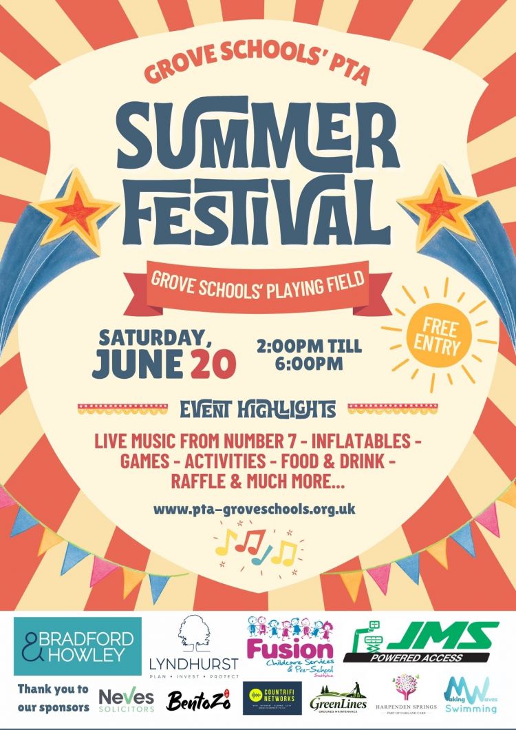 The Grove Schools Summer Festival is back on Saturday 20th June from 2-6pm! Organised by the PTA to raise valuable funds for the school, this highly anticipated community event promises to be an afternoon packed with family-friendly activities, delicious food and live music. It's the perfect way to enjoy a summers day and enjoy quality time with friends and family. The event is free to attend, although donations on the gate are welcome.