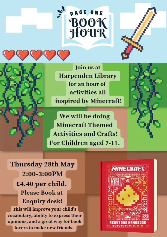 Join us at Harpenden Library for Page One; Minecraft edition! An hour of activities and crafts all inspired by Minecraft.