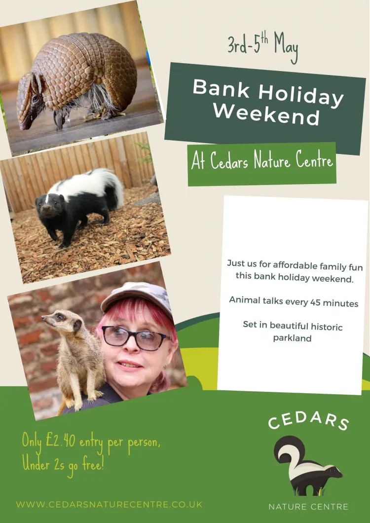 Come and visit Cedars Nature Centre this weekend. Entry is just £2.40 pp and includes all animal talks and events including feeding the Meerkats and the fish and the mystery animal meet and greet! Set in a beautiful historic parkland!