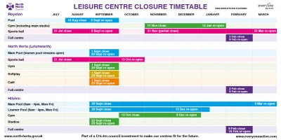 Regrettably, due to the scale of the works some temporary closures are unavoidable, however we are working closely with our leisure operator partner, Everyone Active, to minimise disruption and make sure you can stay active throughout the works by: