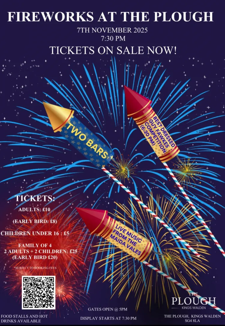 Join us for an unforgettable evening of fireworks, live music, food, and fun at The Plough, Kings Walden! ๐