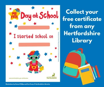 Starting school or nursery is a big milestone – visit your local library to find out how we can support little one’s learning journeys and collect a free My First Day at School Certificate, available from all Hertfordshire Libraries to celebrate!