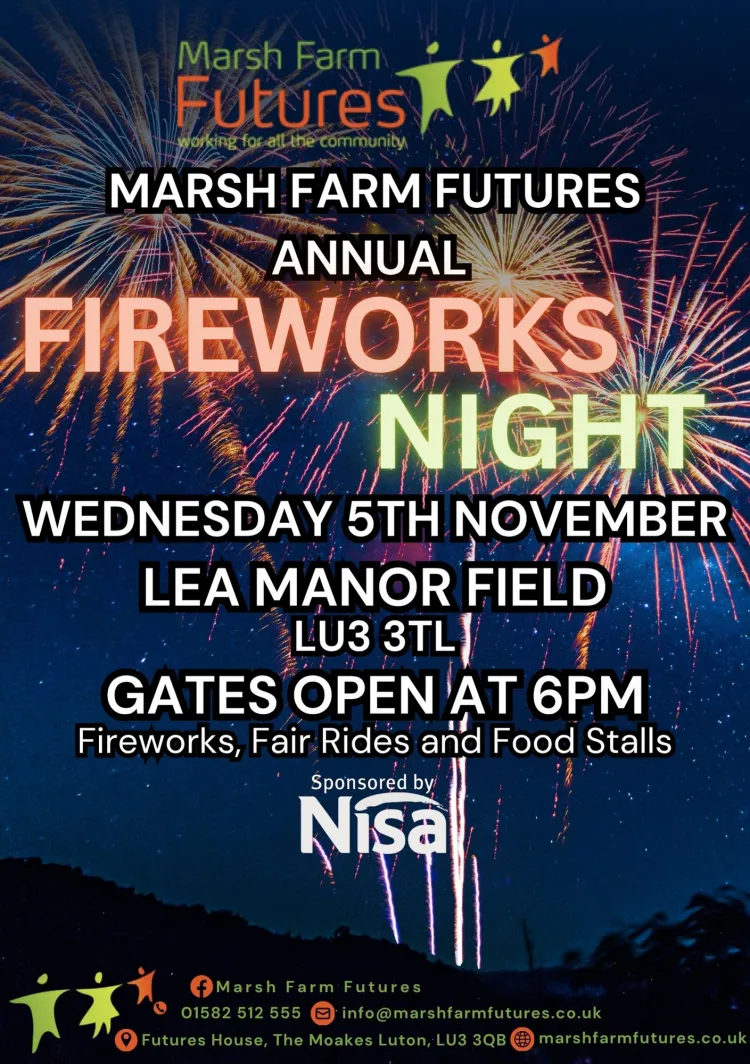 Join Marsh Farm Futures for their annual fireworks display, includes funfair rides and food stalls!