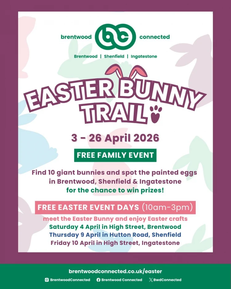 The Easter Bunny Trail from Brentwood Connected will take place from Friday 3 April to Sunday 26 April 2026. Visitors to Brentwood, Shenfield and Ingatestone this Easter can spot our 10 giant bunnies in businesses, decorated and named by local schools and groups. There will also be painted Easter eggs to find in windows throughout the High Streets and prizes to be won! 🔎