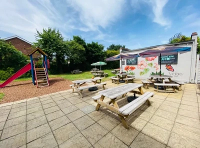 'We Serve Extremely Tasty Food! – Everything here is made from fresh ingredients by our fantastic team of chefs. We only use the best cuts of meat sourced from Marsh’s Butchers & Fresh Veg sourced locally. Every meal is made to order. Our Kitchen is currently open from Wednesday to Saturday serving the main menu and on Sundays when it’s our amazing roast dinners! We have a huge beer garden with plenty of room to just turn up. Your kids will love our new play area! We have an undercover heated area and a decking area if you prefer to be in the sun. Or just plot up in the garden on one of the many benches available.'