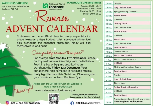 St Albans and District Foodbank have launched their Reverse Advent Calendar for 2025. Each day, for 25 days, you are invited to make a food donation to the foodbank to help make Christmas that little bit easier for local families and households who find themselves in food crisis.  Click here to download/print a copy of the calendar.