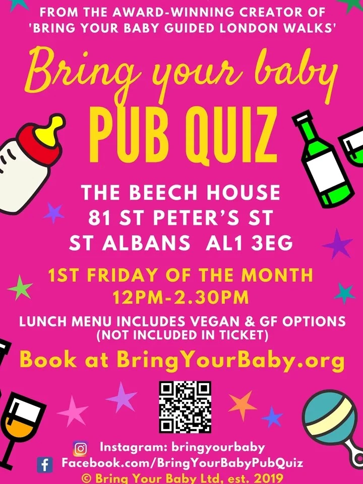 From the award-winning creator of 'Bring Your Baby Guided London Walks', 'Bring Your Baby Pub Quizzes' are fun, brain-stimulating daytime parent socials, which take place all over London, St Albans, Hitchin, Harpenden, Oxford, Bath, Stroud, Orpington and Epsom.